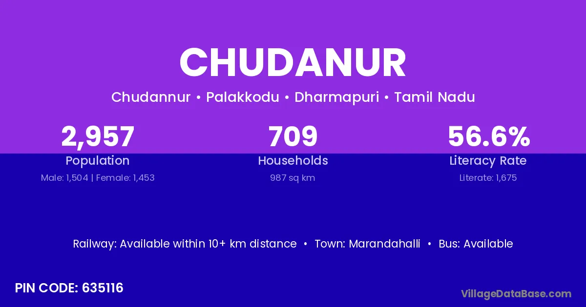 Chudanur village has a total population of 2,957 people, of which 1,504 are males and 1,453 are females.