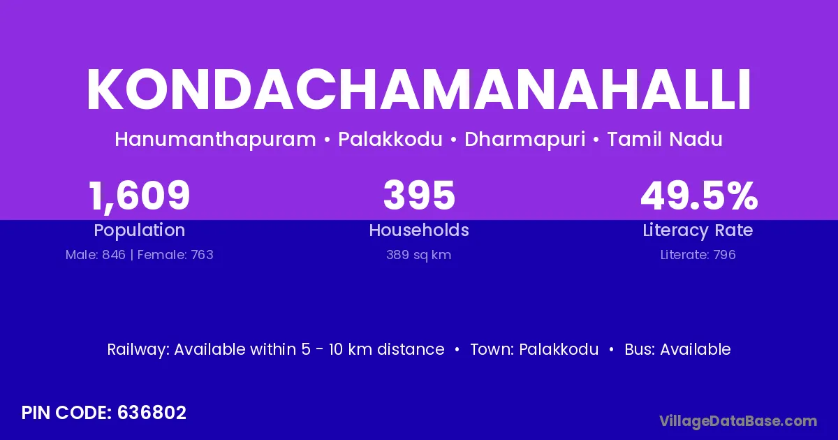 Kondachamanahalli village has a total population of 1,609 people, of which 846 are males and 763 are females.
