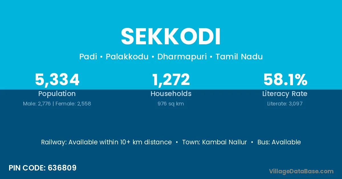 The literacy rate of Sekkodi village is 58.06%. Male literacy stands at 66.43% and female literacy at 48.98%.