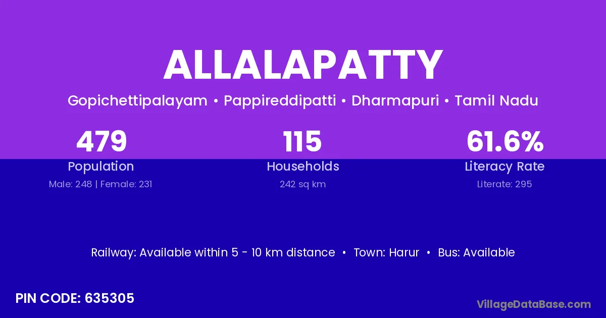 According to Census 2011 information, the village code of Allalapatty village is 635305.
