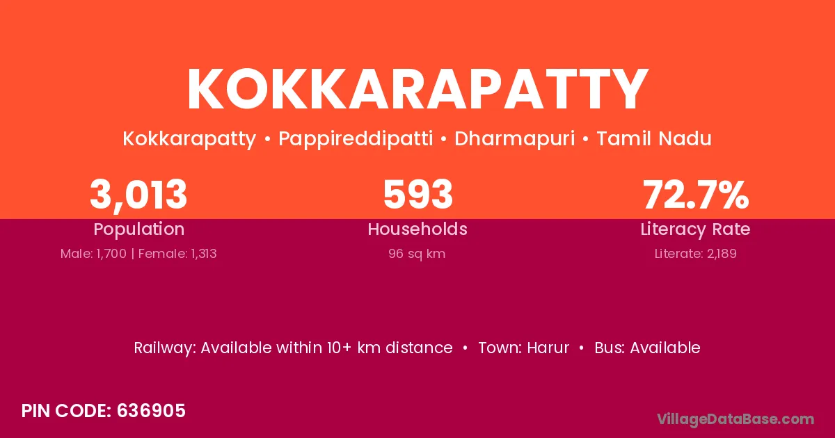 Kokkarapatty village has a total population of 3,013 people, of which 1,700 are males and 1,313 are females.
