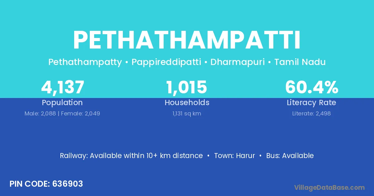 Pethathampatti village has a total population of 4,137 people, of which 2,088 are males and 2,049 are females.
