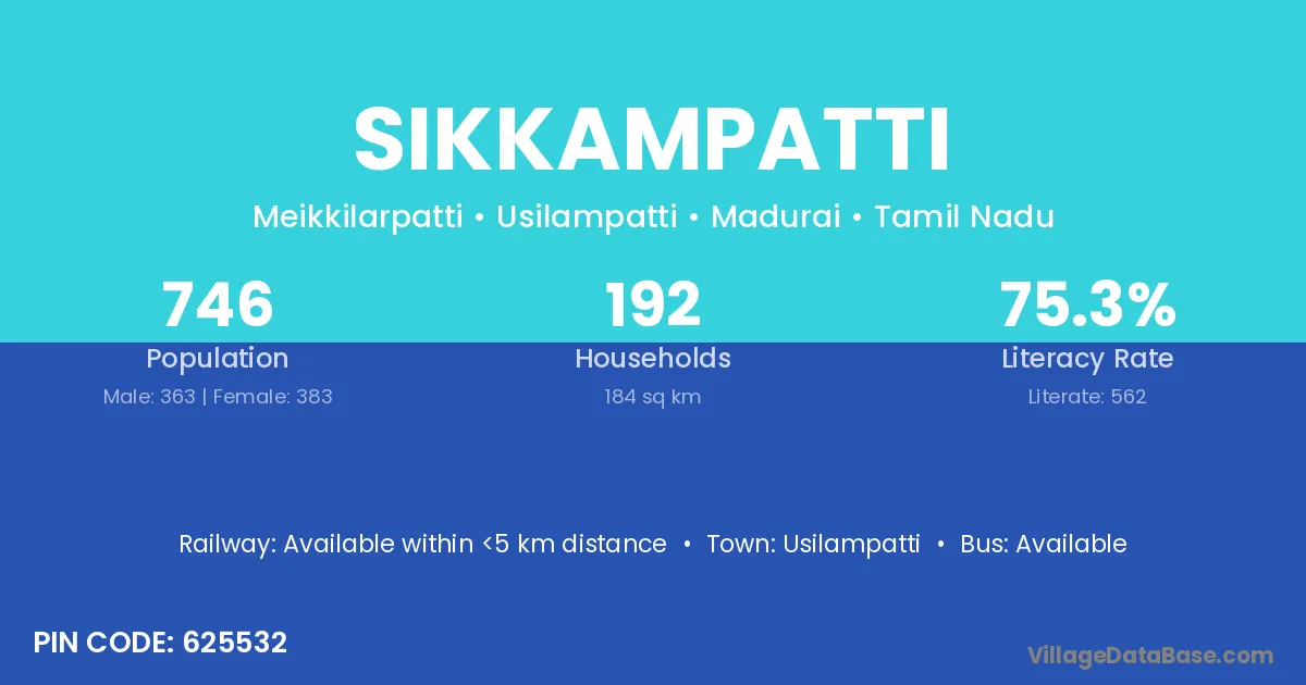 Sikkampatti village has a total population of 182 people, of which 91 are males and 91 are females.