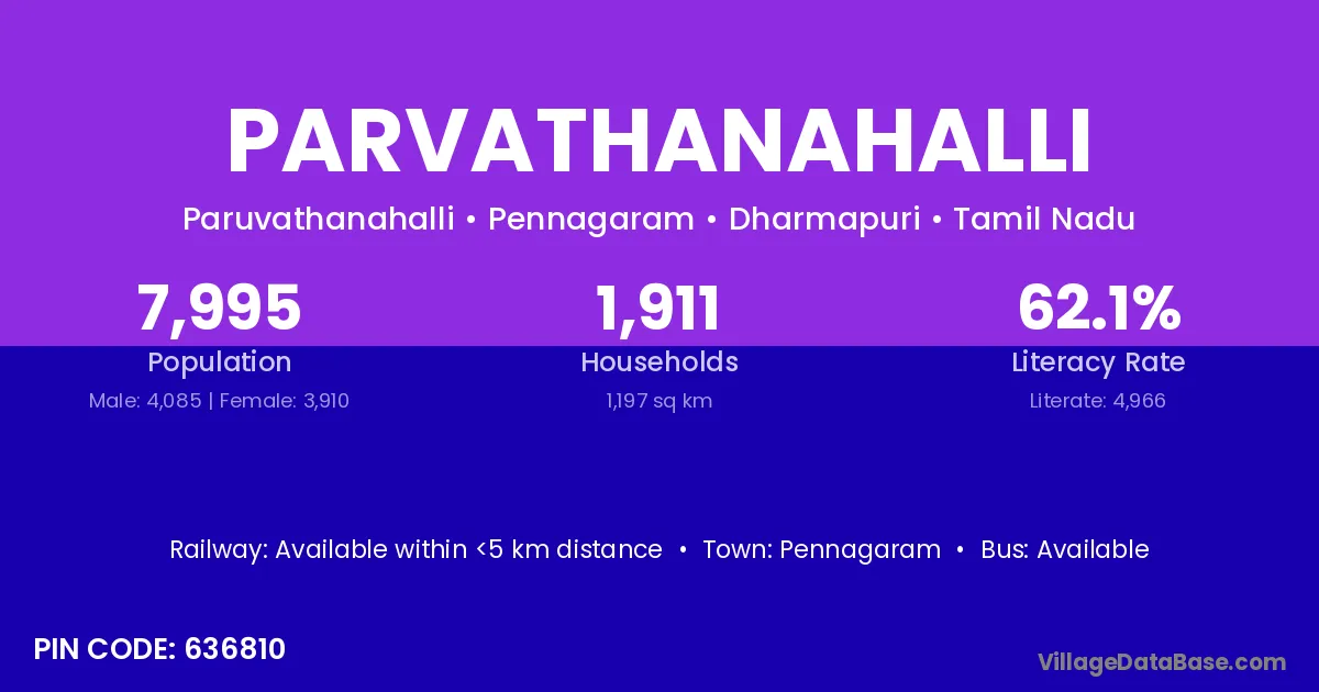Pennagaram is the nearest town to Parvathanahalli village for major economic activities