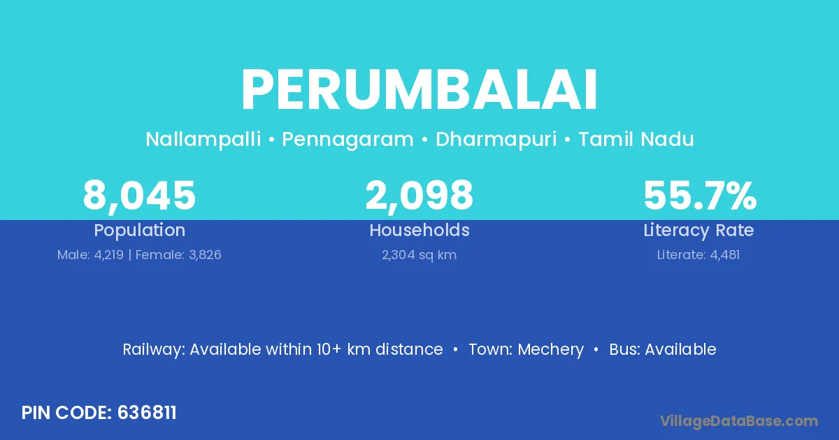Perumbalai village has a total population of 8,045 people, of which 4,219 are males and 3,826 are females.
