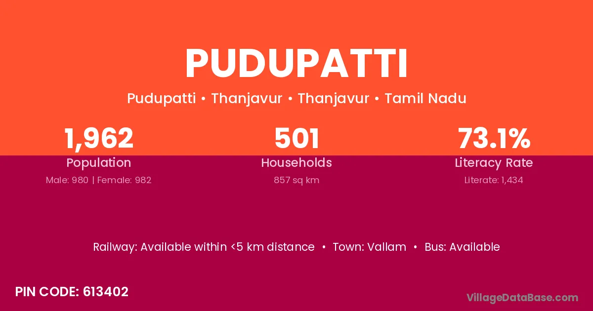 Pudupatti village has a total population of 4,043 people, of which 2,120 are males and 1,923 are females.