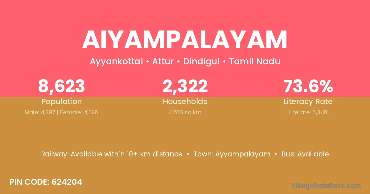 Aiyampalayam village has a total population of 8,623 people, of which 4,297 are males and 4,326 are females.