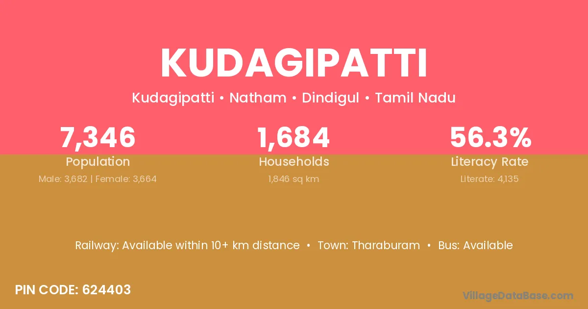 Kudagipatti village has a total population of 7,346 people, of which 3,682 are males and 3,664 are females.