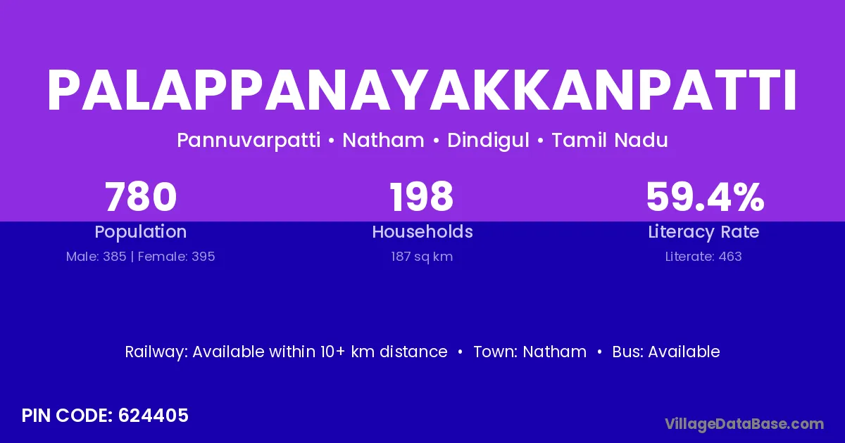 Palappanayakkanpatti village has a total population of 780 people, of which 385 are males and 395 are females.