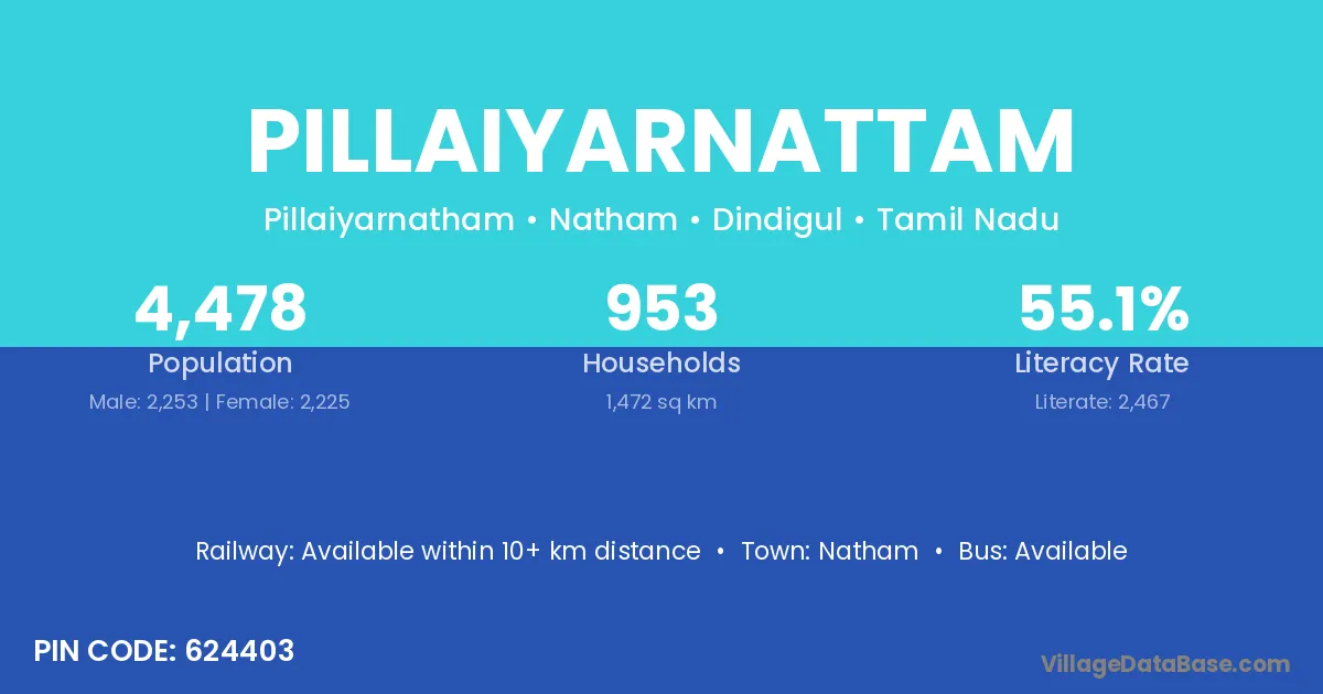Pillaiyarnattam village has a total population of 4,478 people, of which 2,253 are males and 2,225 are females.