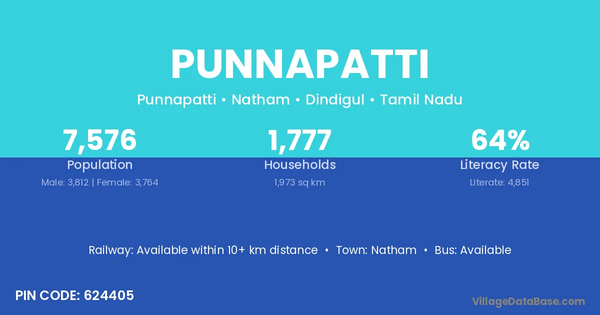 Punnapatti village has a total population of 7,576 people, of which 3,812 are males and 3,764 are females.