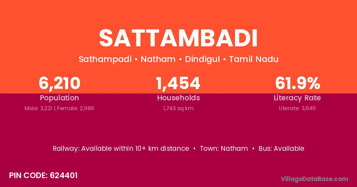 Sattambadi village has a total population of 6,210 people, of which 3,221 are males and 2,989 are females.