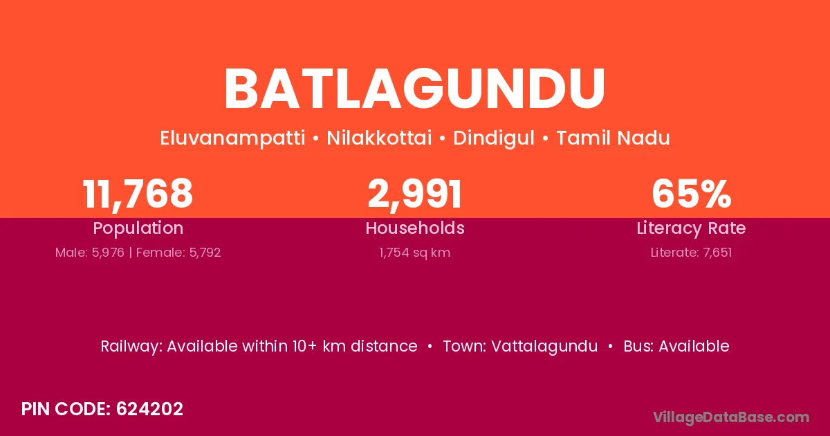 Batlagundu village has a total population of 11,768 people, of which 5,976 are males and 5,792 are females.
