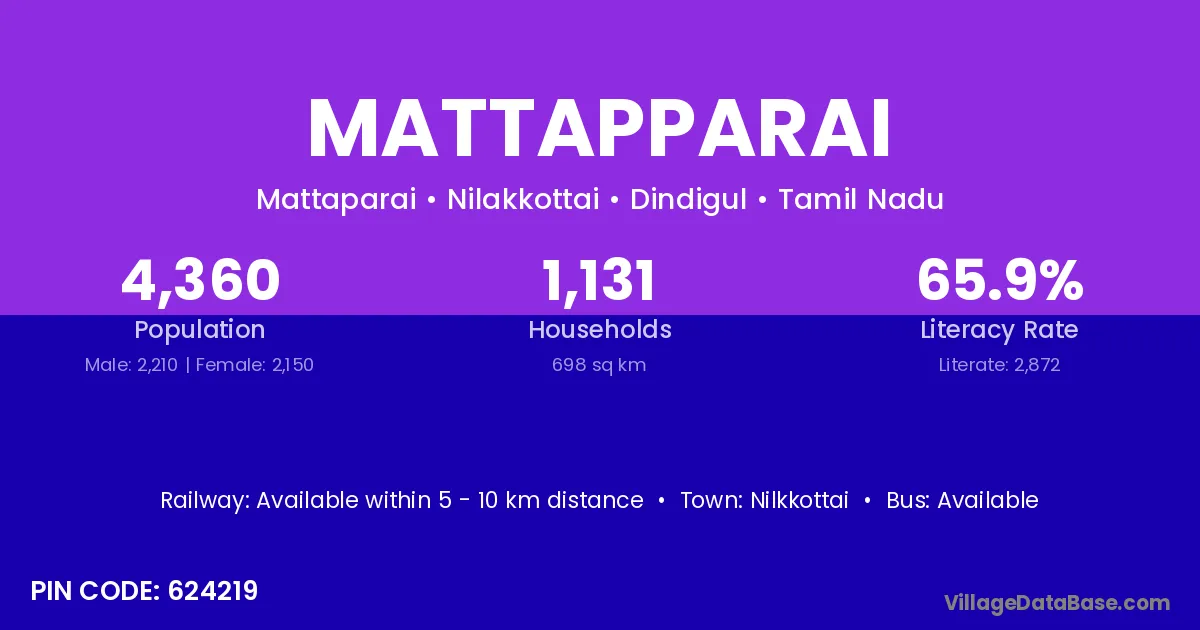 Mattapparai village has a total population of 4,360 people, of which 2,210 are males and 2,150 are females.