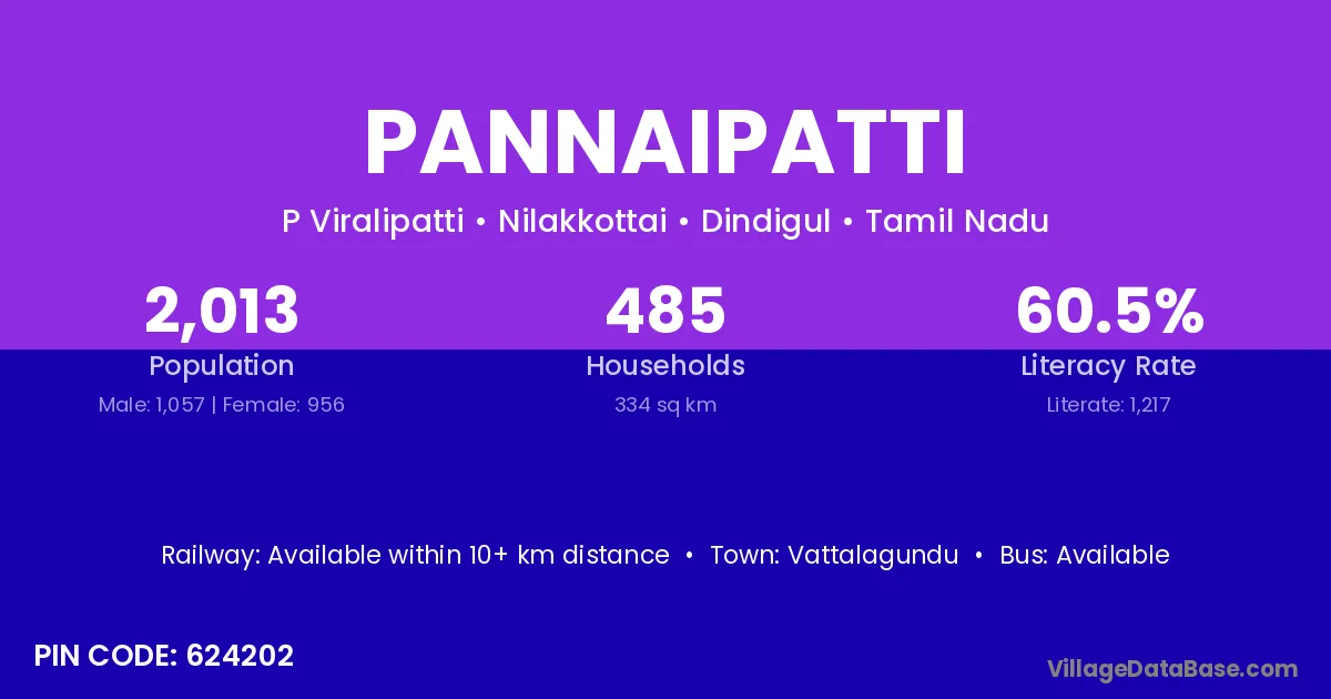 Pannaipatti village has a total population of 2,013 people, of which 1,057 are males and 956 are females.