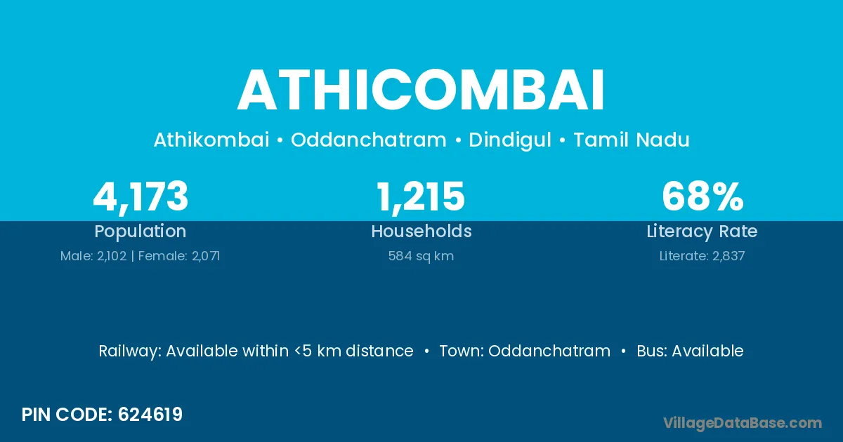 Athicombai village has a total population of 4,173 people, of which 2,102 are males and 2,071 are females.