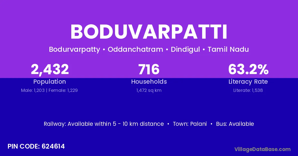 Boduvarpatti village has a total population of 2,432 people, of which 1,203 are males and 1,229 are females.