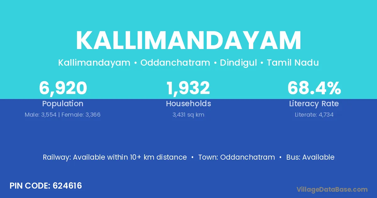 Oddanchatram is the nearest town to Kallimandayam village for major economic activities