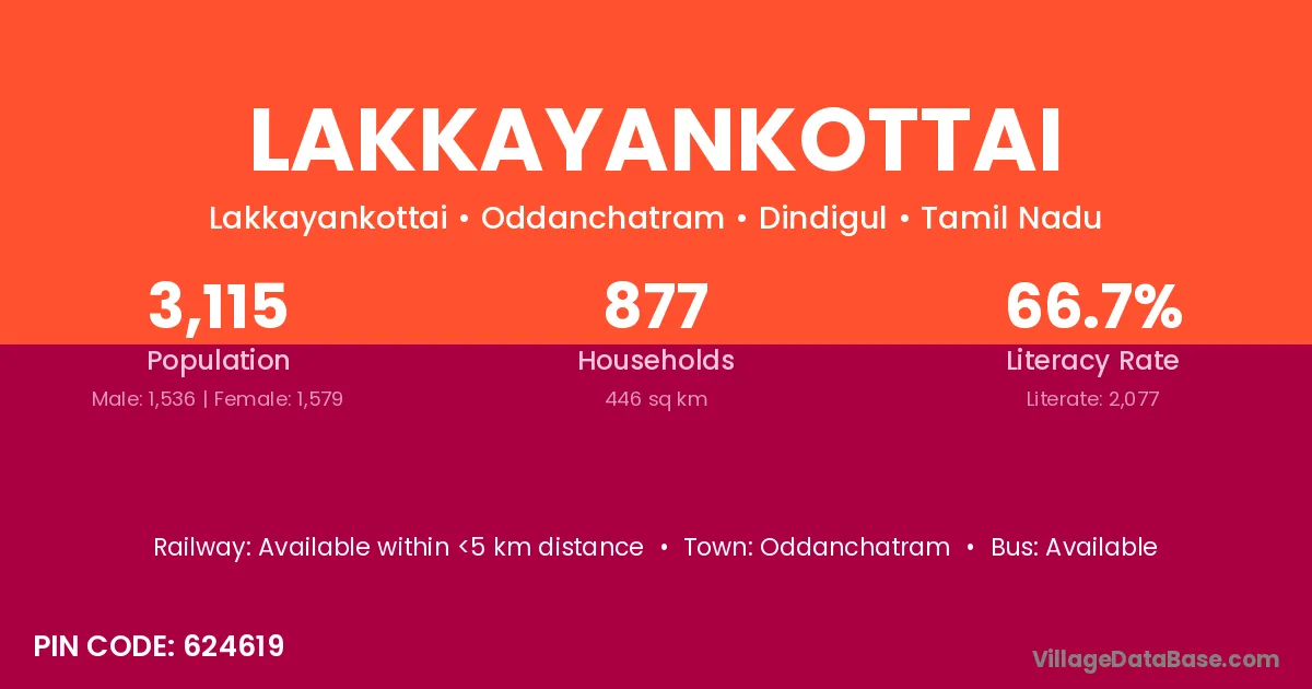 According to Census 2011 information, the village code of Lakkayankottai village is 624619.