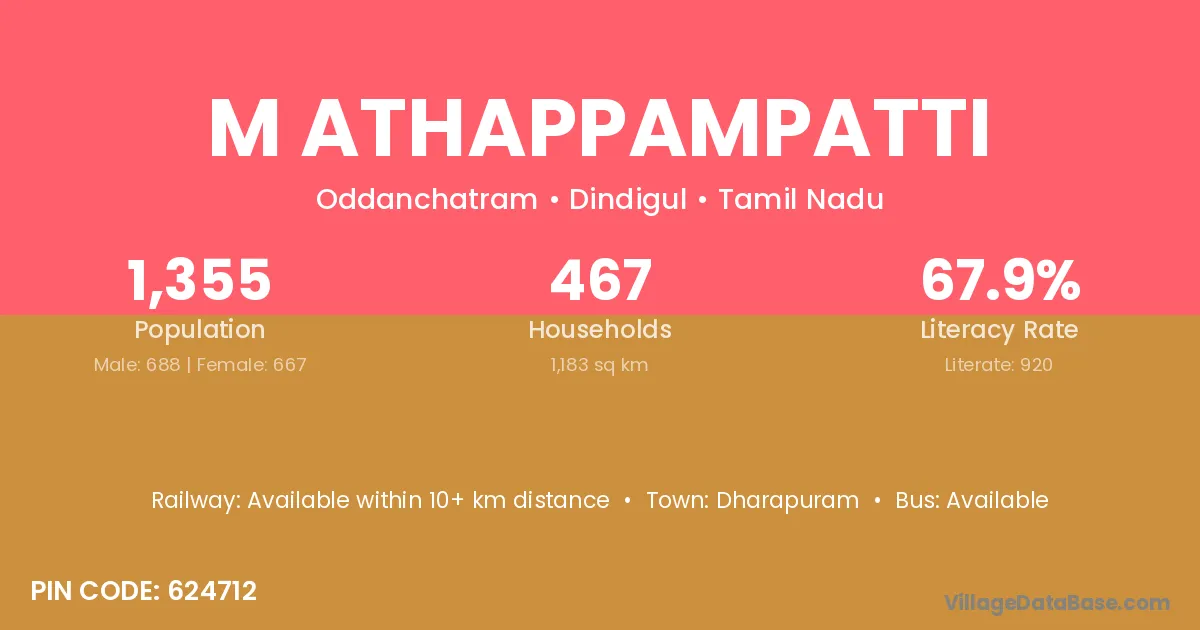 M Athappampatti village has a total population of 1,355 people, of which 688 are males and 667 are females.