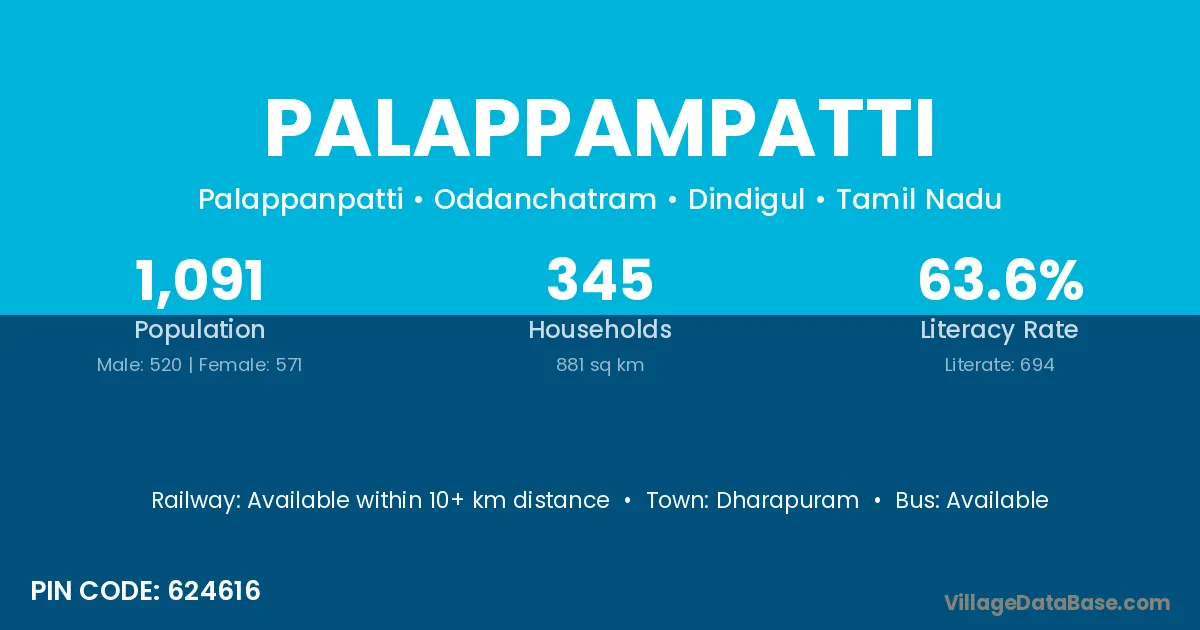Palappampatti village has a total population of 1,091 people, of which 520 are males and 571 are females.