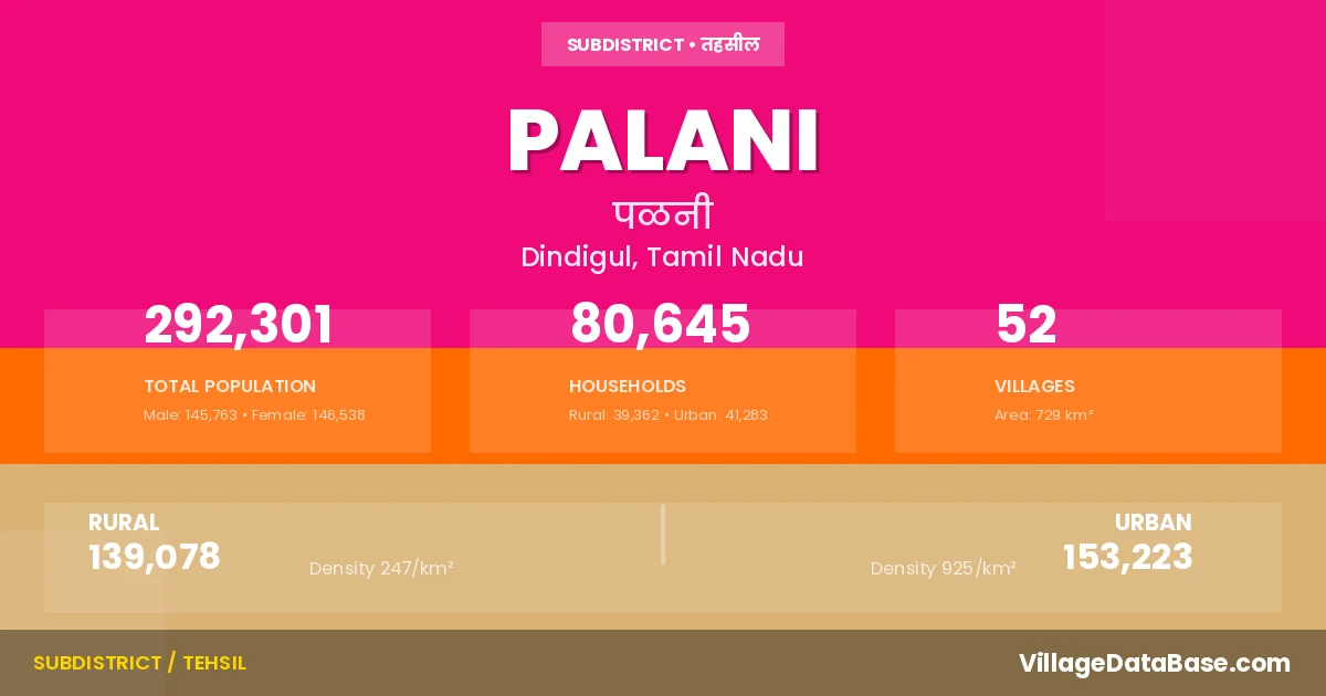 According to the 2011 census The total area of Palani Taluka is 729 km², with a population of 292301 people. The population density is 401 inhabitants per square kilometre, and there are approximately 80645 houses in the sub district.