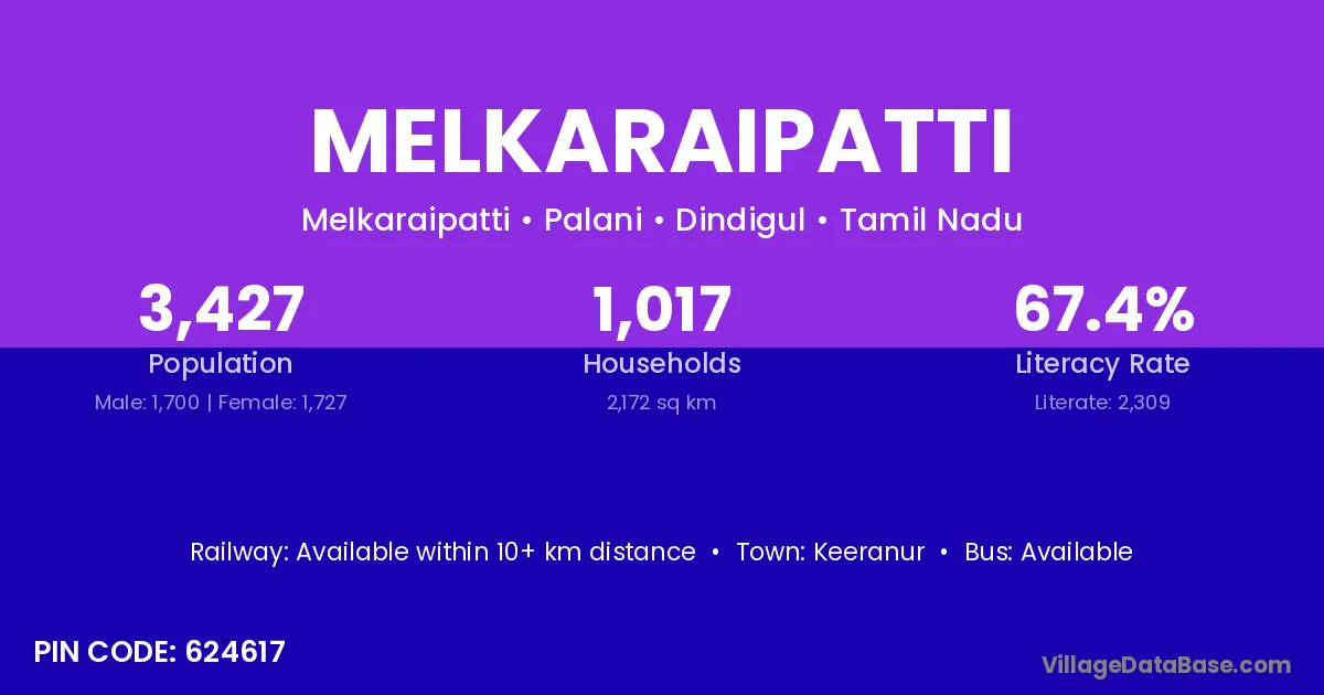 Melkaraipatti village has a total population of 3,427 people, of which 1,700 are males and 1,727 are females.