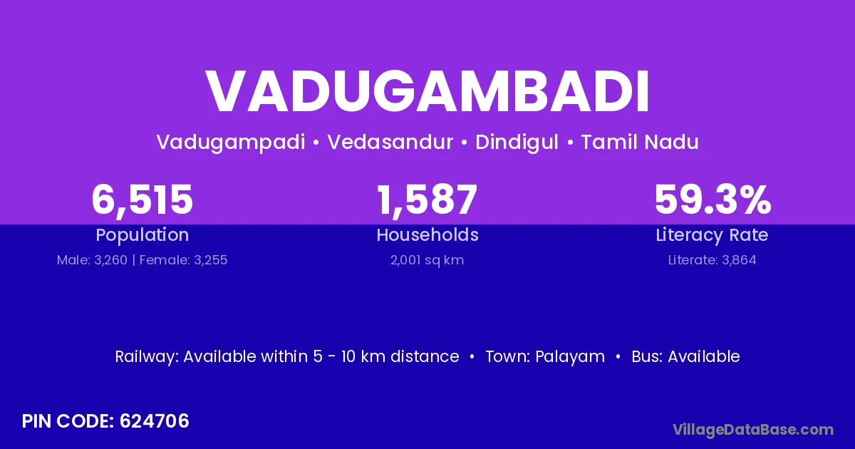 Vadugambadi village has a total population of 6,515 people, of which 3,260 are males and 3,255 are females.
