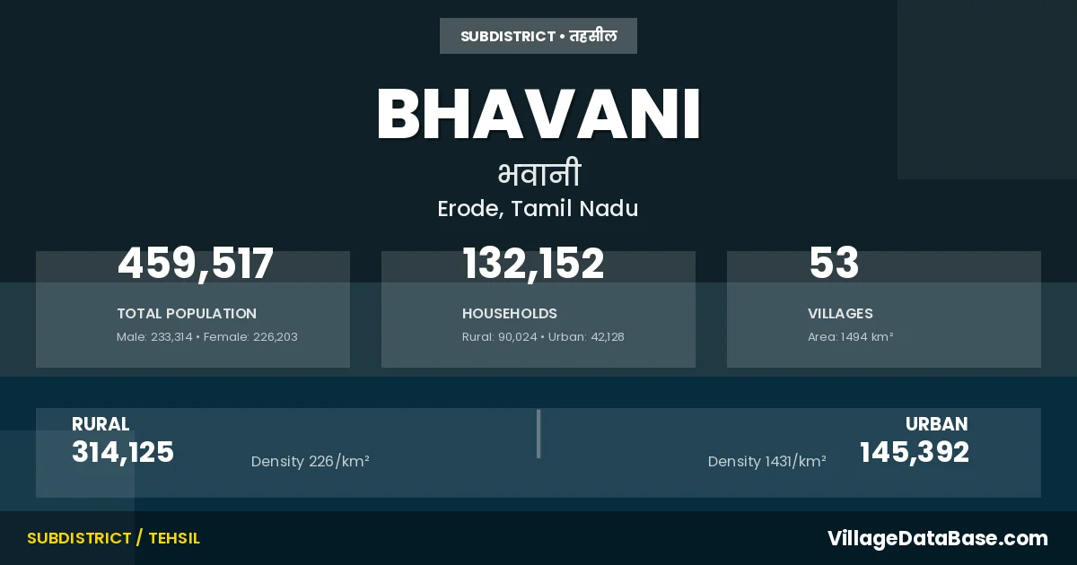 According to the 2011 census The total area of Bhavani Taluka is 1494 km², with a population of 459517 people. The population density is 308 inhabitants per square kilometre, and there are approximately 132152 houses in the sub district.