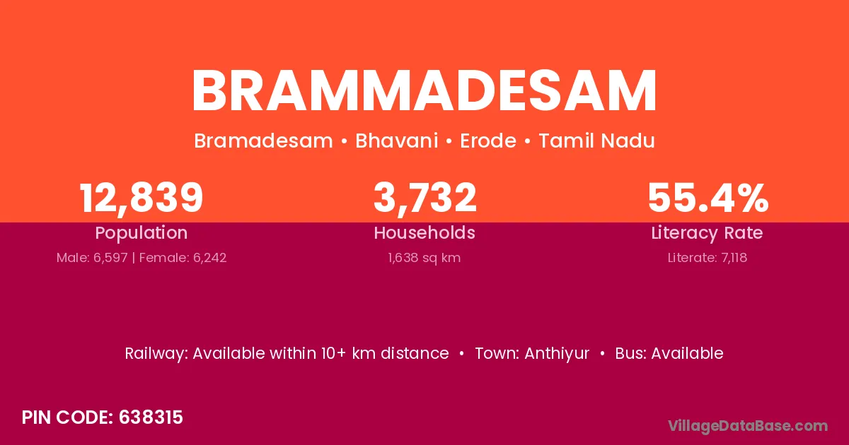 Brammadesam village has a total population of 12,839 people, of which 6,597 are males and 6,242 are females.