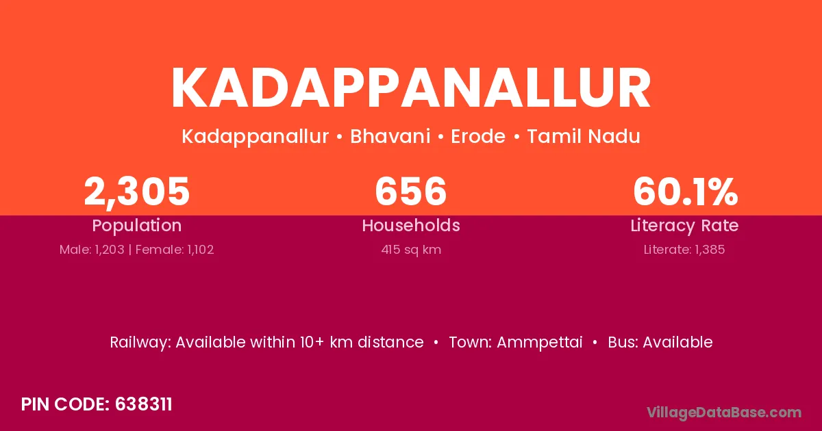 Kadappanallur village has a total population of 2,305 people, of which 1,203 are males and 1,102 are females.
