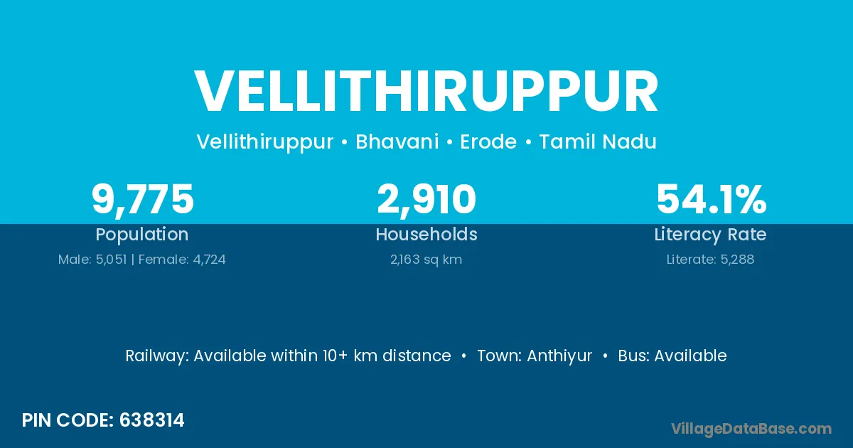 Vellithiruppur village has a total population of 9,775 people, of which 5,051 are males and 4,724 are females.