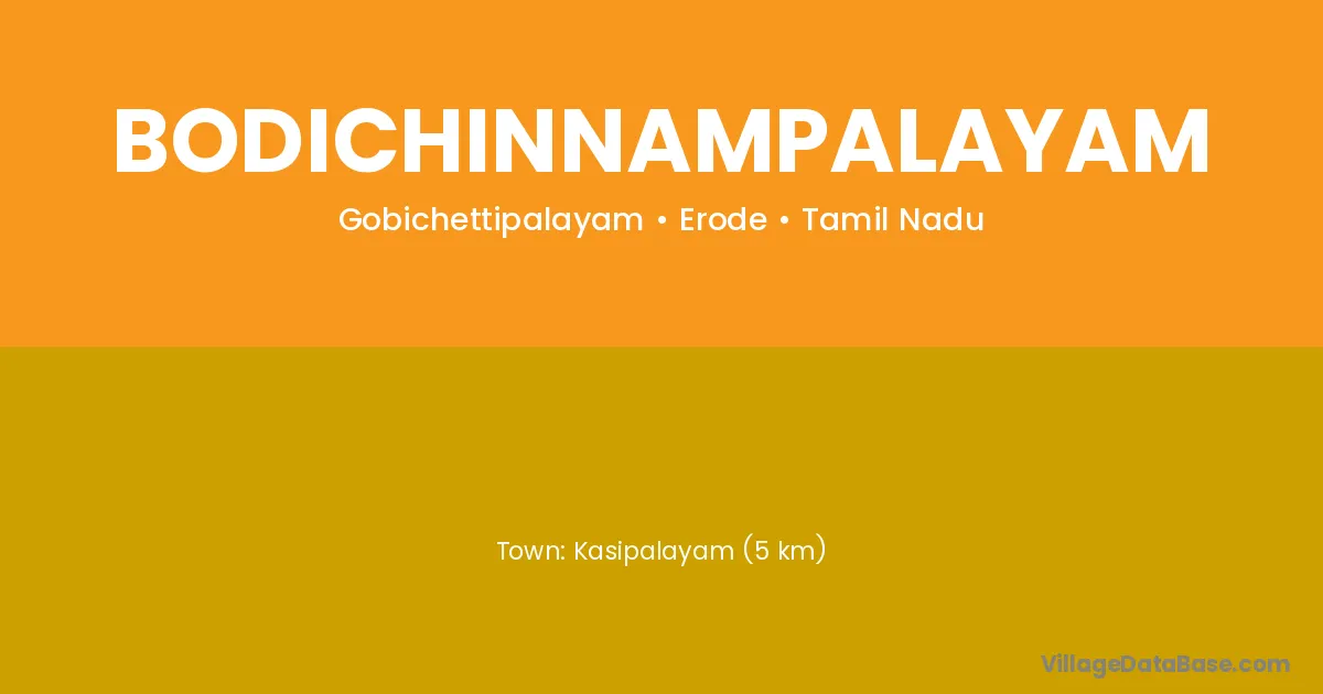 Kasipalayam (5 km) is the nearest town to Bodichinnampalayam village for major economic activities and is located approximately 5 km away.