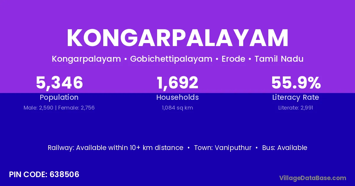 Kongarpalayam village has a total population of 5,346 people, of which 2,590 are males and 2,756 are females.