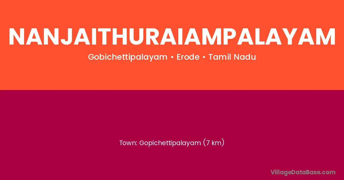 Gopichettipalayam (7 km) is the nearest town to Nanjaithuraiampalayam village for major economic activities and is located approximately 7 km away.