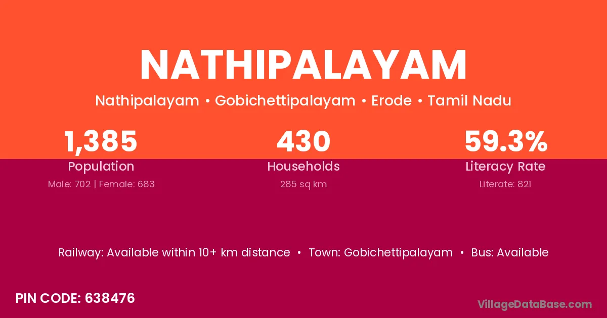 Nathipalayam village has a total population of 1,385 people, of which 702 are males and 683 are females.