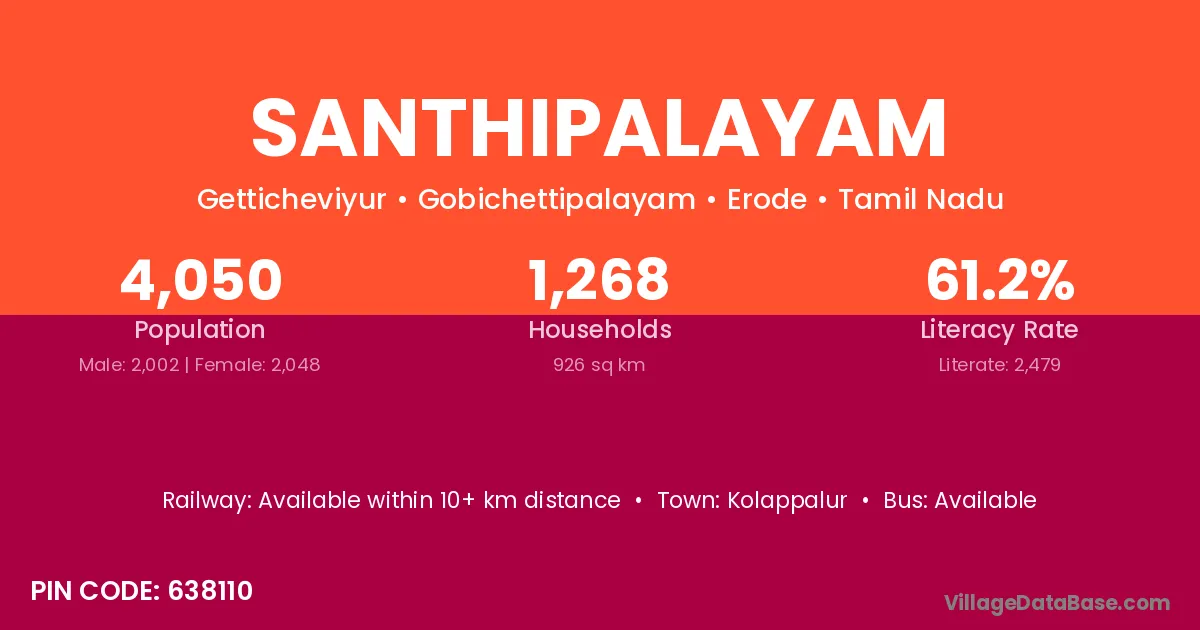 Santhipalayam village has a total population of 4,050 people, of which 2,002 are males and 2,048 are females.