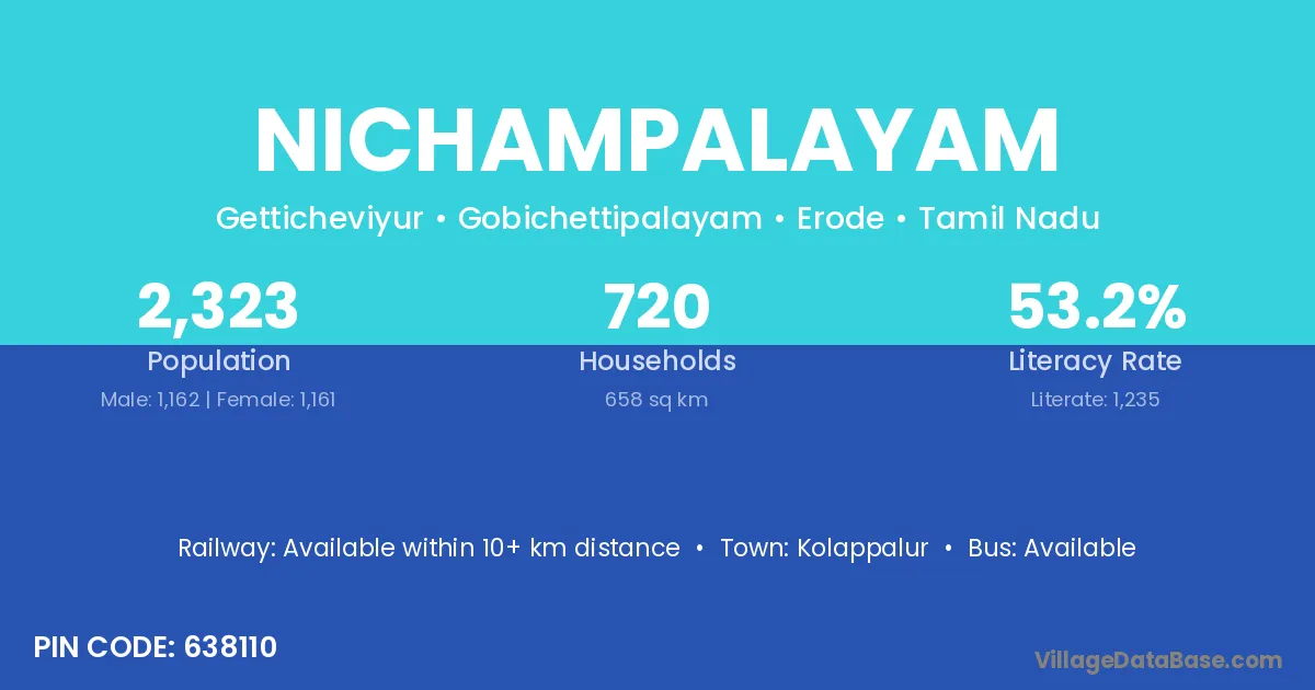 Nichampalayam village has a total population of 4,698 people, of which 2,365 are males and 2,333 are females.