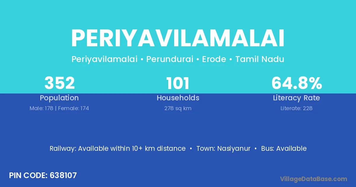 Periyavilamalai village has a total population of 352 people, of which 178 are males and 174 are females.