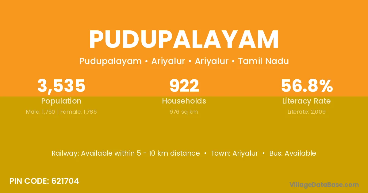 Pudupalayam village has a total population of 1,217 people, of which 621 are males and 596 are females.
