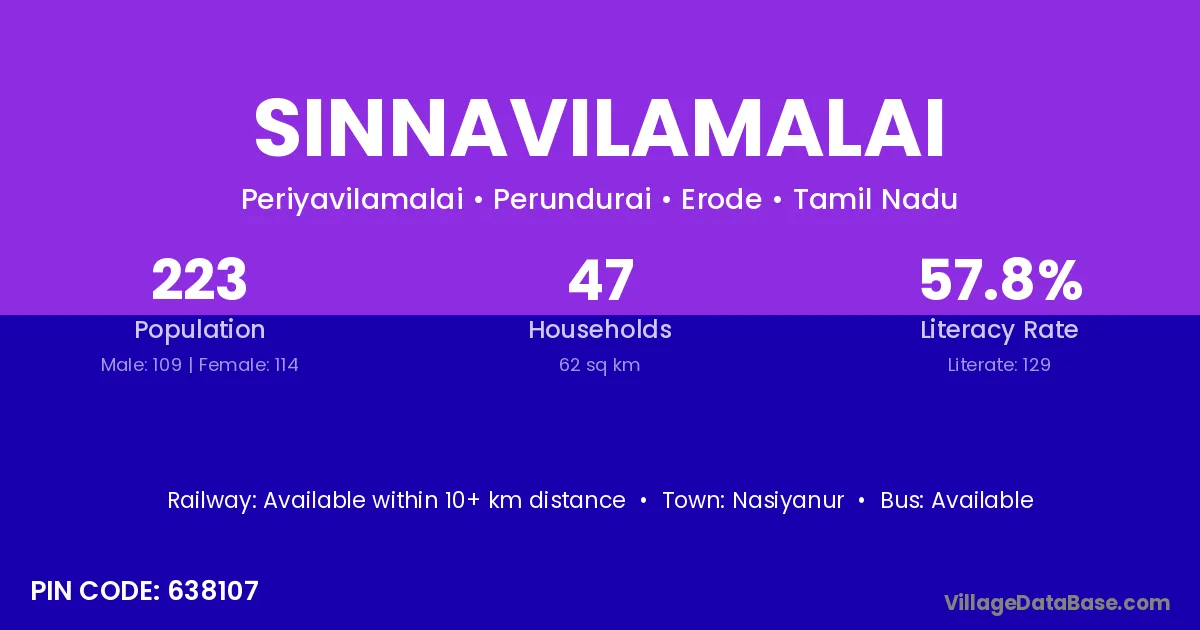 Sinnavilamalai village has a total population of 223 people, of which 109 are males and 114 are females.