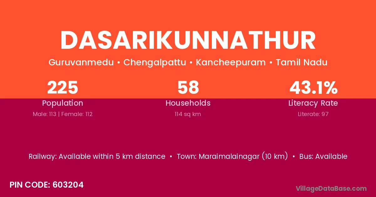 Dasarikunnathur village has a total population of 225 people, of which 113 are males and 112 are females.