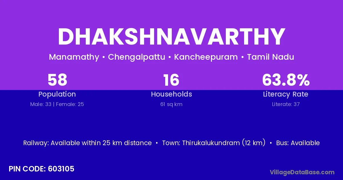 Thirukalukundram (12 km) is the nearest town to Dhakshnavarthy village for major economic activities and is located approximately 12 km away.
