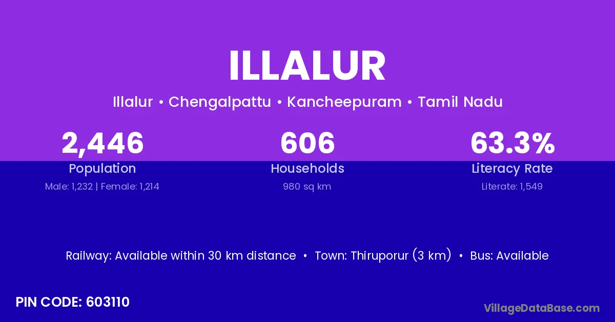 Thiruporur (3 km) is the nearest town to Illalur village for major economic activities and is located approximately 3 km away.
