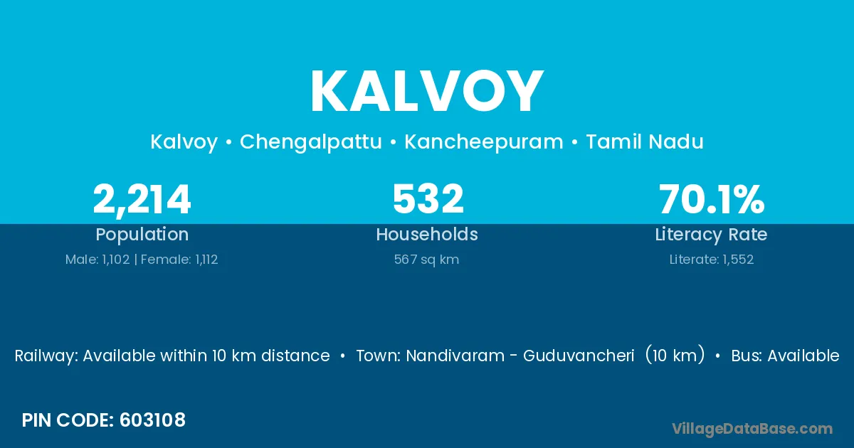 Nandivaram - Guduvancheri (10 km) is the nearest town to Kalvoy village for major economic activities and is located approximately 10 km away.