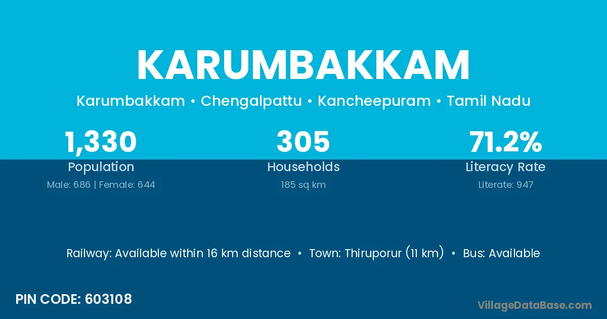 Thiruporur (11 km) is the nearest town to Karumbakkam village for major economic activities and is located approximately 11 km away.