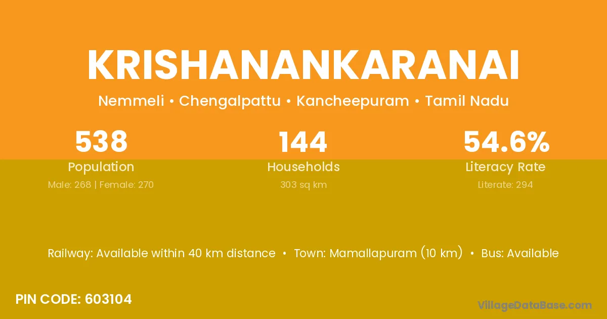 According to Census 2011 information, the village code of Krishanankaranai village is 603104.