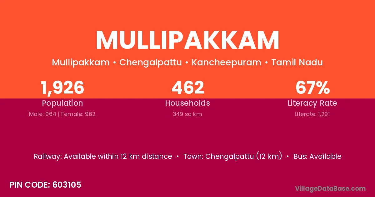 Mullipakkam village has a total population of 1,926 people, of which 964 are males and 962 are females.
