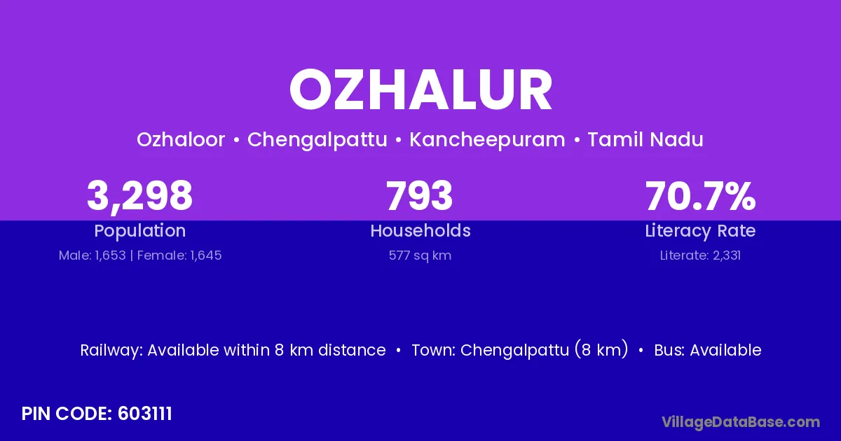Chengalpattu (8 km) is the nearest town to Ozhalur village for major economic activities and is located approximately 8 km away.