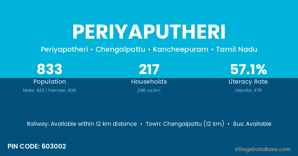 Chengalpattu (12 km) is the nearest town to Periyaputheri village for major economic activities and is located approximately 12 km away.